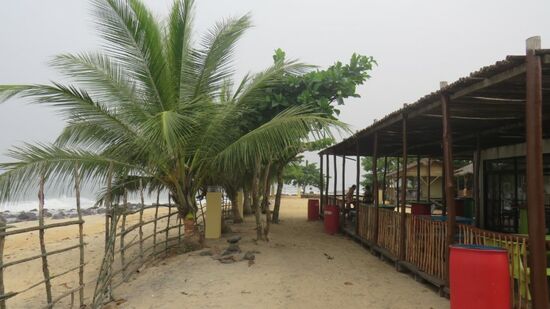 Dort nimmt uns eine Immigrationsbeamtin, mehr PR Managerin in Empfang, meint ‚no Problem‘ und verschwindet mit unseren Pässen. Ich gehe mal zum Zoll, werde nach meinem CdP gefragt, mein LP wird sofort autorisiert. In der Zwischenzeit ist unsere Ms. PR zurück, hat unsere Pässe einem Helfer zum Eintragen der Aufenthaltserlaubnis gegeben, aber anstatt zu arbeiten sucht der wieder mal den Ausreisestempel. Erst nach ein paar (er-)klärenden Worten von Ms. PR schwingt er Stift und Stempel, wir dürfen uns 30 Tage hier aufhalten und auch das LP wird entsprechend dekoriert. Fertig? Nein, erst nochmal Nase ins Zollbüro gesteckt, alles klar, dann zur Gesundheitskontrolle mit Überprüfung von Gelbfieberbuch und kontaktloser Temperaturkontrolle 33,5º, cool, dann ums Eck ganz nach hinten ins letzte Büro was auch immer darin sein mag, wo unsere Daten nochmals in ein Buch eingetragen werden und dann wartet auch schon Mr. Card Brune auf uns. Der zeigt uns erst mal ‚offizielles Dokument‘ nachdem alle ausländischen Card Brune in Liberia gegen US$10 registriert werden müssen, an dieser Einreisesteuer führt kein Weg vorbei. Gut 75 Minuten sind seit dem Grenzstrick vergangen – und wir sind wieder unterwegs – bis zum nächsten über die Strasse gespannten Strick ein paar km weiter. Hier heisst es nochmals aussteigen, Nase und Pass vorzeigen, Passdaten eintragen lassen, am nächsten Strick wollen die dann nur noch unseren Pass sehen und geben uns dafür den Tipp, dass die von uns geplante Strasse eher eine unscheinbare Piste ist, die von der Hauptstrasse abzweigt. Stimmt, wir finden dies Kreuzung und fahren auf nasser, Wasser-Schlagloch übersäter Piste Richtung Norden bis ans Meer, erreichen Robertsport und lassen uns dort auf dem CP der Sea Monkey Lodge nieder (US$ 10 pP/N). Hier hat ein Schweizer Ehepaar ein Zentrum für Surfer geschaffen, in dem auch durchreisende Overlander willkommen sind – für uns die Location für den bevorstehenden ‚Doppel-Feiertag‘,