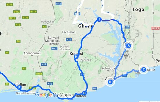 entlang der Westküste Richtung Süden bis Kap der Guten Hoffnung und dann wieder zurück entlang der Ostküste bis nach Egypten.