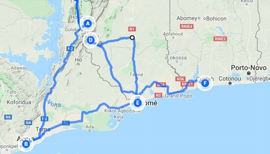 entlang der Westküste Richtung Süden bis Kap der Guten Hoffnung und dann wieder zurück entlang der Ostküste bis nach Egypten.