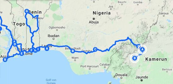 entlang der Westküste Richtung Süden bis Kap der Guten Hoffnung und dann wieder zurück entlang der Ostküste bis nach Egypten.