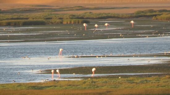schauen über die Bucht den Flamingos beim Abendessen zu, geniessen das Leben in der freien Natur.