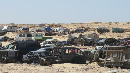 bis dann endlich bei Guerguerat die Grenze zu Mauretanien erreicht ist. Die Grenzanlagen werden derzeit neu erbaut, das Computerzeitalter wirft schon seine Schatten voraus, aber bis es soweit ist müssen eben immer noch Bücher und Listen von Hand ausgefüllt werden. Trotzdem haben wir nach knapp 30 Minuten Polizei, Zoll und den grossen Autoscanner passiert, sind wir auf dem Weg durchs Niemandsland, folgen von Autowracks gesäumte Fahrspuren auf einer Steinpiste,