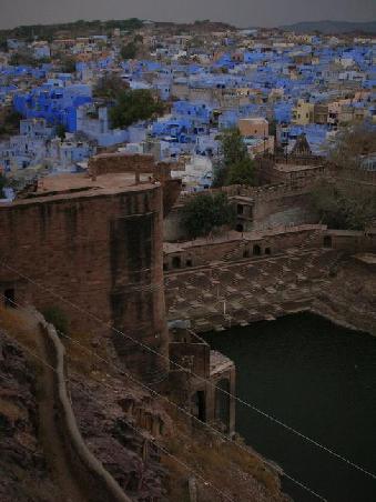 Jodhpur, am Fuss eines riesigen Felsens liegend, welcher komplett mit einem Fort bebaut ist, traegt diese Stadt den touristischen Beinamen 'Blaue Stadt'. Dies ruehrt daher dass die Haueser frueher einmal so gut wie alle mit blauer Farbe getuencht wurden. Uber den Grund gibt es verschiedene Geschichten, die einfachste: Blau haelt in der sengenden Wuestensonne kuehl und die Muecken ab. Die irgendwie Glaubwuerdigste: Urspruenglich als Kennzeichen der Bramanen wurde die Farbe irgendwann auch von anderen Einwohnenrn uebernommen, naja und noch ne Reihe anderer.