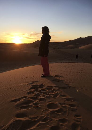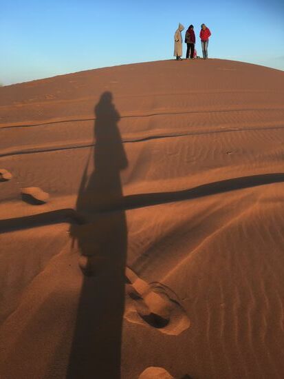 Zwei Berber, die auch schon in der Wüste unterwegs waren, machten ein paar Fotos von uns. Anschließend packten sie auf dem Hügel ihre kleinen Waren aus und luden uns zum kaufen ein. Ich verzog mich recht schnell in eine andere Richtung. Andrea und Susanne ließen sich von den beiden Bewerbern ihren Namen in die Sahara malen. Gerne hätten sie dafür ein Bakschisch gegeben, doch wer nimmt zu einem Spaziergang in den Sonnenaufgang schon Geld mit?