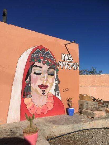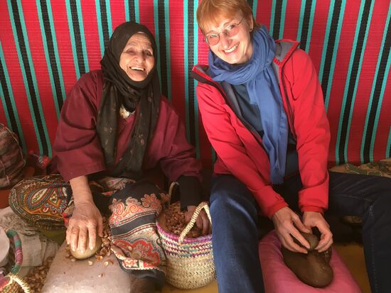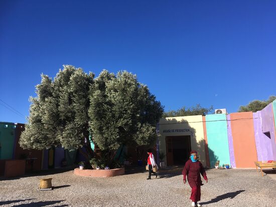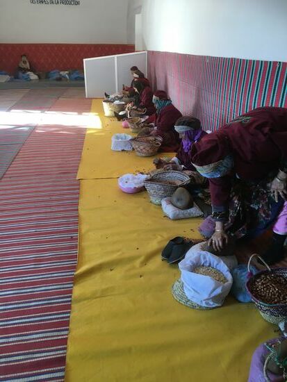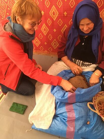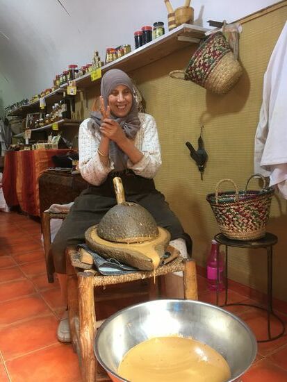1999 wurde die „Union des Coopératives des Femmes de l’Arganeraie“ gegründet – als erster Verbund lokaler Kooperativen. Die Arbeit in den Kooperativen hilft den Frauen, ihre wirtschaftliche und soziale Situation zu verbessern. Wir besuchten kurz eine davon – die Frauenkooperative Marjana, die als einzige die Früchte der umliegenden Bäume ernten darf. Die Bäume hier gehören dem Staat. „Marjana“ ist eine eigene Marke, hier kauft auch der König die Produkte, um sie als Gastgeschenke zu nutzen. Sie sind daher auch nicht eben billig.