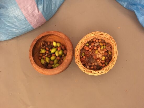 Er erzählte uns auch, dass die Beeren hart sind und eine dicke und bittere Schale haben. Werden sie reif, sind sie gelblich bis orange oder rötlich. Der glatte, hellbräunliche und mandelgroße, sehr harte Kern besteht aus einem einzelnen oder aus bis zu vier zusammengewachsenen Samen. Diese enthalten jeweils einen weißlichen Samenkern in Form eines Plättchens, der etwa so groß wie ein großer Sonnenblumenkern ist. Aus diesen „Samenplättchen“ wird dann das Öl gewonnen.