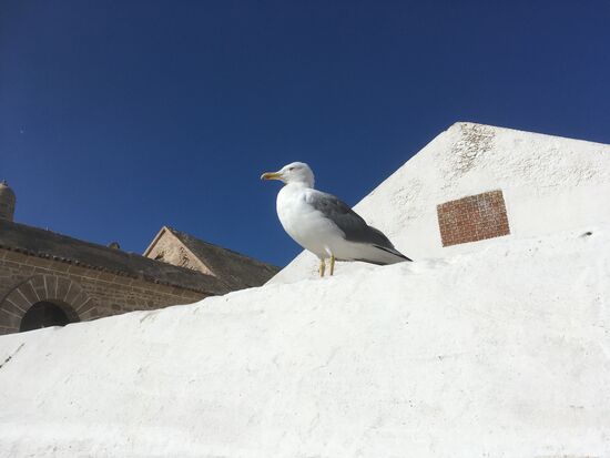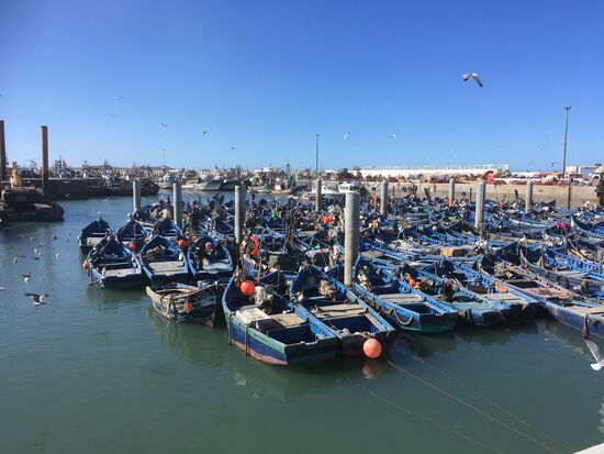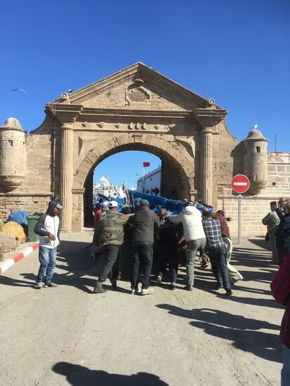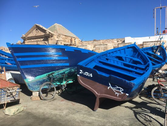Die hier verwendeten Fischerboote sind aus Holz, das blau angestrichen ist. Diese Bauweise geht auf eine mehr als 3.000 Jahre alte Tradition zurück. Die Phönizier haben die Bauart mitgebracht. Wir sahen zu, wie ein Boot zu Wasser gelassen wurde. Etwa 15 Männer hielten es auf der kleinen Vorrichtung auf Rädern. Doch vor einem Tor rutschte das Boot von ihr runter. Mit vereinten Kräften gelang es den Männern schließlich, das Boot wieder in die Spur zu bringen. Der Weg hinunter zum Wasser war noch einmal beschwerlich, denn die kleine Straße führt recht steil nach unten und die Männer brachten all ihre Kraft auf, damit das Boot ihnen nicht wegsauste. Überall waren Fischer, die ihre Netze flickten oder auch ihren Fang bearbeiteten, indem sie die Fische ausnahmen. Die Reste warfen sie den Möwen hin. Die stürzten sich sogleich mit einer Macht darauf, dass wir einen Schritt zur Seite springen mussten, um nicht umgeworfen zuwerfen. Es werden hier sehr viele verschiedene Fische geangelt, am meisten jedoch Sardinen. Diese werden dann nach Casablanca gebracht, wo sie überwiegend für den Export weiter verarbeitet werden.