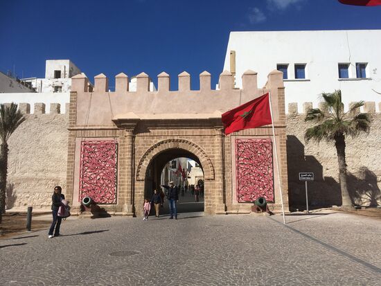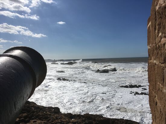 Die engen Gassen mit den unzähligen Geschäften sind natürlich auch in Essaouira vorhanden. Bunt, quirlig....schön. Wir suchten einen Weg aus dem Gewirr zum Meer. Das war gar nicht so einfach. Einige Male endete unser Weg durch ausgesprochen flache Torbögen an Wohnungseingangstüren – auch diese bunt, fast immer mit Fliesen umgeben. Also wieder zurück. Letztlich haben wir es geschafft und fanden uns an einer Festungsanlage, von wo aus wir einige Zeit der tosenden Brandung zusahen. Und schon waren die eineinhalb Stunden fast um und wir traten den Rückweg zum Bus an.