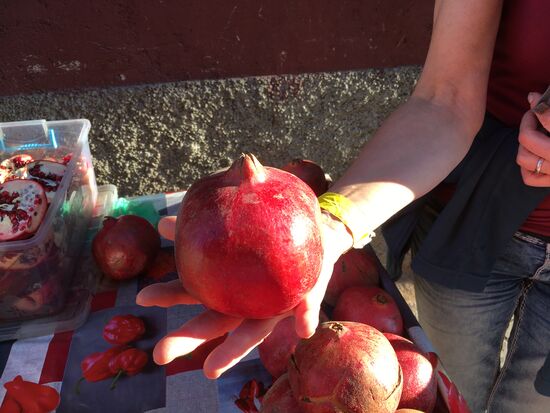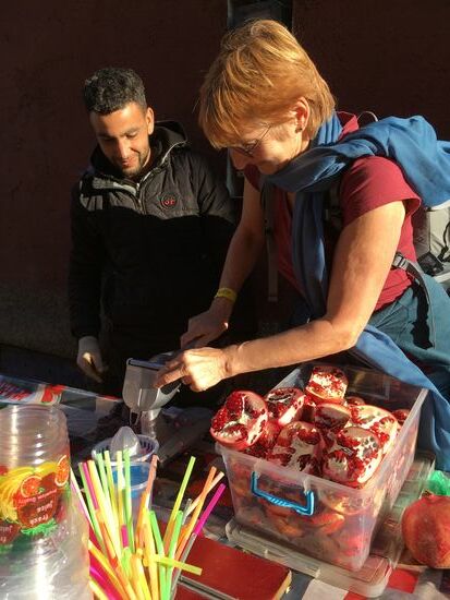 Noch ein frisch gepresster Granatapfelsaft sollte es sein, diesmal von einem Stand, wo er noch mit einer Handpresse hergestellt wurde. Andrea durfte selbst Hand an die Presse legen. Es war ordentlich mühsam und aus vielen Kernen floss gar kein Saft heraus. So übernahm der junge Mann die Arbeit wieder und schnell hatte ich meinen Saft.