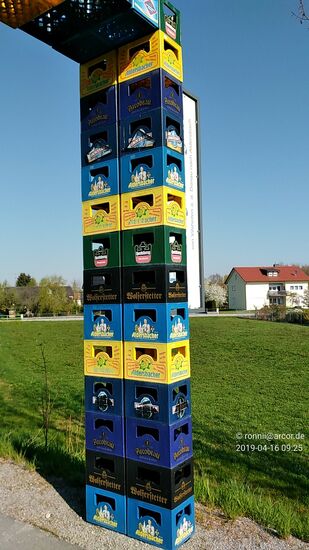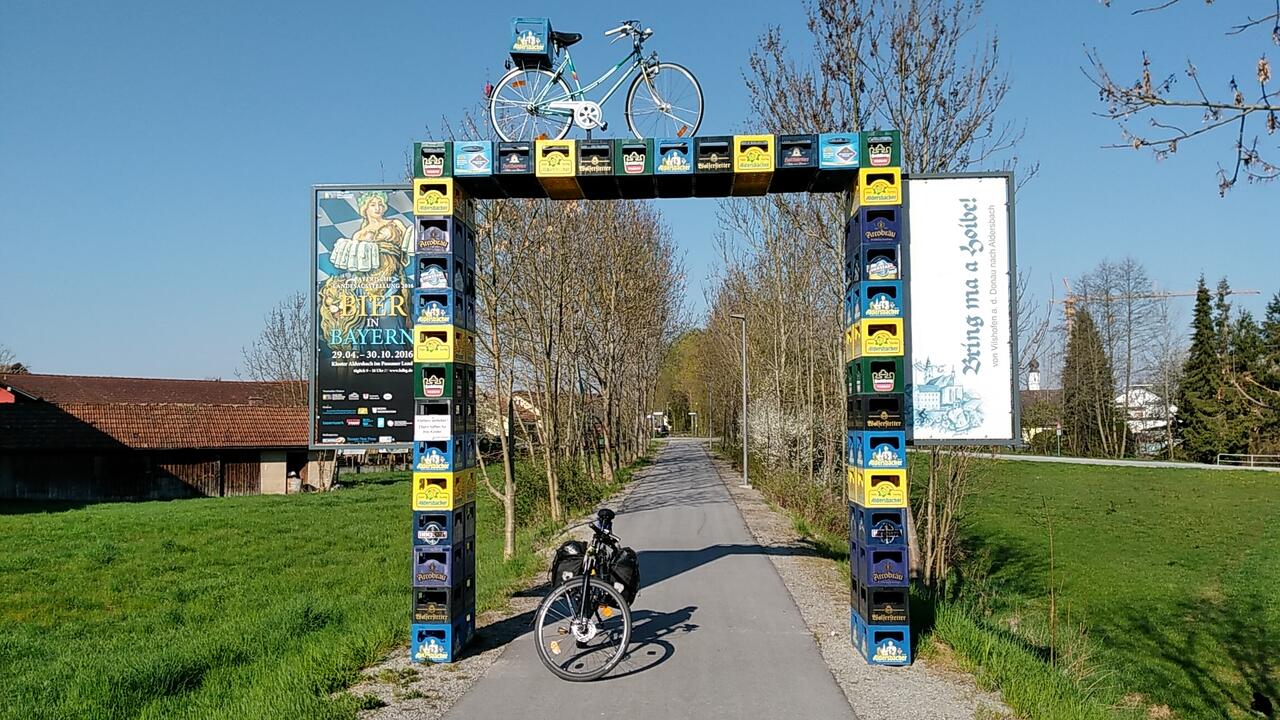 Das witzig gehaltene Start- bzw. Zieltor (ein Gegenstück dazu steht in Vilshofen in der nächster Nähe zum Yachthafen) besteht aus 76 Limo- und Bierträgern, die einsturzsicher an Stahlträgern befestigt sind. In Aldersbach empfängt der Bierradlweg auch die Radler, die vom Radweg auf der ehemaligen Bahntrasse zwischen Aidenbach und Aldersbach ankommen und diese direkt zur Brauerei und Kloster Aldersbach führt.