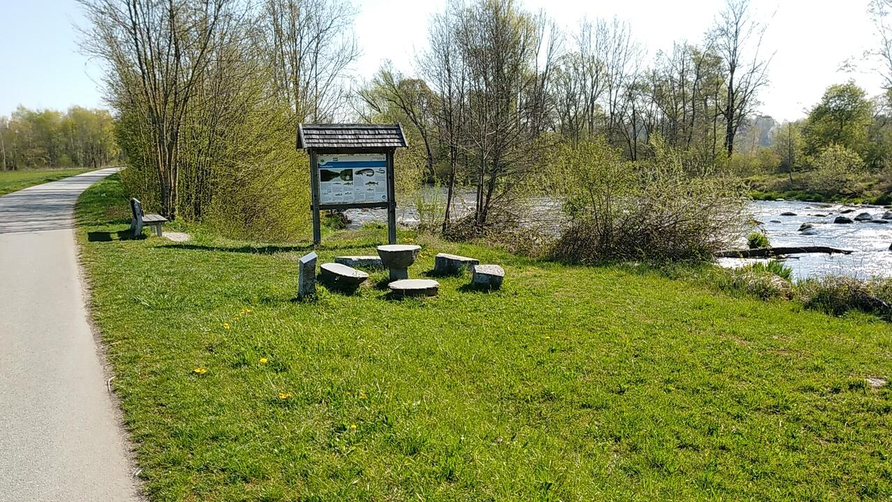 Lädt eigentlich zur gemütlichen Rast ein, aber die Sitzblöcke waren trotz des strahlenden Sonnenscheins kurz vor 10 Uhr Mitte April noch zu kalt.