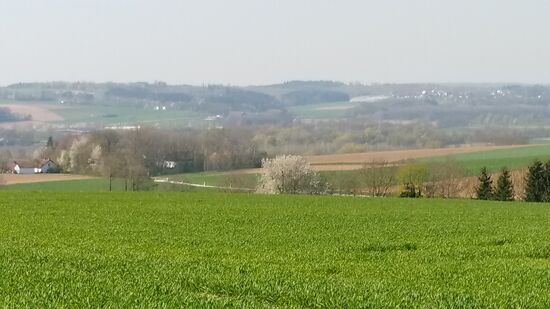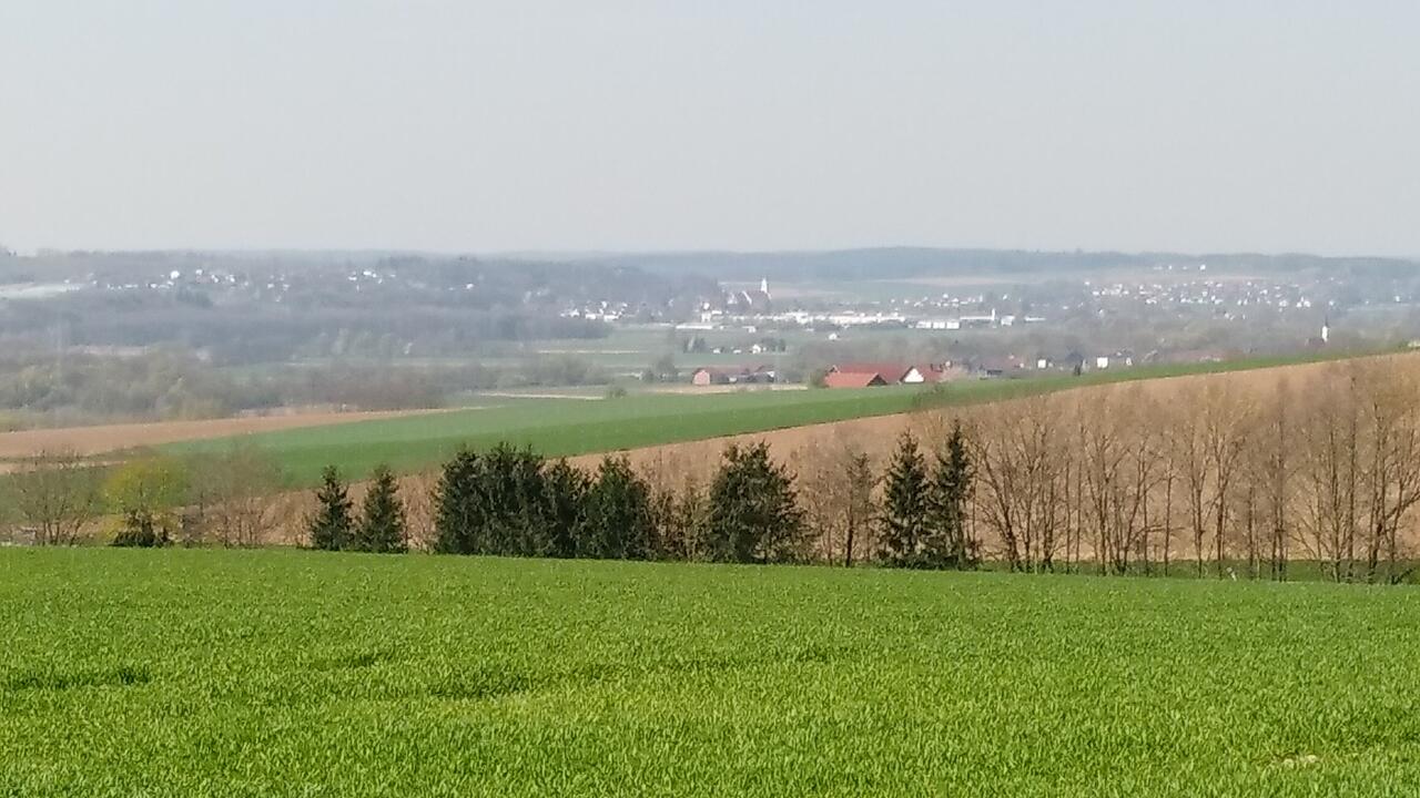 In der Ferne lassen sich äußerst schemenhaft Ausläufer des Bayerischen Waldes erahnen, davor liegt das Donautal.