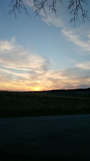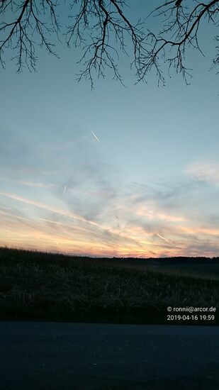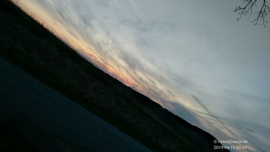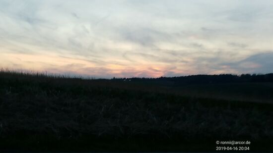 Nach dem Einchecken bei den "Rauchdoblers", suche ich am Abend gegen 19:42 Uhr zu Fuß nochmals die bereits angesprochene Metallbank am Schild mit dem Familienwappen auf und lasse längere Zeit die Abendstimmung entspannend auf mich einwirken, bis mich die überhandnehmende April-Abend-Frische wieder in die wohlig gewärmte Unterkunft zurück "dirigiert" und das reichhaltige von meiner Herbergsfamilie aufgetischte Abendessen ansteht.