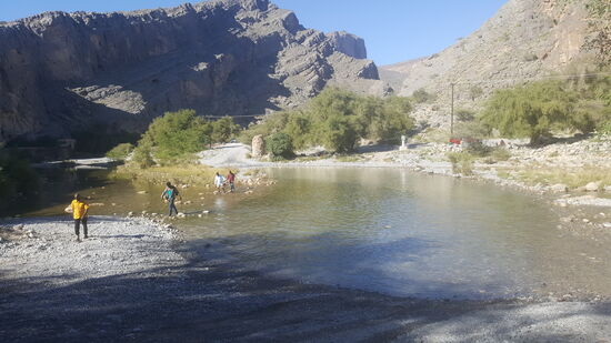 Wir fahren um das verlassene Taruf herum zum Wadi Taruf—hier sind einige Leute mit ihren 4x4 und durchqueren das Wasser.