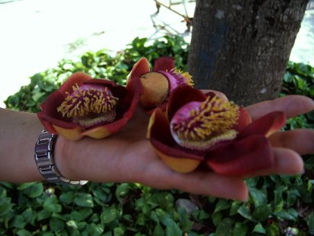 In der Pagode angekommen empfaengt uns ein freundlicher Moench . Stephan, als Mann, wird sogar auf einen Tee mit ihm eingeladen, waehrend Sara weiter das Innere erkundet. Draussen im Garten zeigt er uns dann noch die wunderschoenen Blueten eines Baumes, dessen Namen wir leider vergessen haben. Im Teich direkt daneben wachsen riesige Seerosen und schwimmen ebenso riesige Elefantenohrfische.