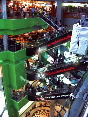Die Nacht war mal nicht so toll! Die Bettmatratze ist hart wie ein Brett und das Kissen, naja ein Hinkelstein waere weicher gewesen. Zudem schreckt Stephan mitten in der Nacht vertraeumt hoch (mit Augenmaske und Laermstop in den Ohren und erzaehlt irgendwas von einem Gecko unterm Bett). Ausschlafen ist auch nicht, denn jeden Morgen puenktlich um 8Uhr wird die Hymne des thailaendischen Koenigs durch oeffentliche Lautsprecher gespielt,das kann dann schonmal 30 Minuten anhalten. Daher goennen wir uns nach solch einer Nacht ein kleines Fruehstueck und eine volle Stunde Oelmassage! Koennen wir nur empfehlen, sehr entspannend und man fuehlt sich danach wie neu geboren! Doch wirklich wach werden wir immernoch nicht und so geht es wieder zurueck ins Bett, bis wir Nachmittags eines der weltgroessten Shoppingcenter, das MBK-Center besuchen. Schon auf dem Weg durch den Stau mit dem Tuk-Tuk bekommen wir Kopfschmerzen. Die Strassen sind...also wenn man sich eine Stunde lang hinter einen Auspuff eines Reisebusses stellt und dazu die heisse Briese der Klimaanlagenabluft vorstellt....ja so war es in den Strassen von Bangkok. Nach einer Stunde angekommen, ueberweltigt uns ein Shoppingcenter auf sieben Etagen. Die einzelnen Sektoren sind so gross wie ganze Kaufhaeuser bei uns! Das war auch zuviel des Guten und angeschlagen mit Kopfweh und dem hektischem Treiben im Center entschliessen wir uns schon nach 20 Minuten wieder zu fahren. Dafuer goennen wir uns Abends dann traditionellen thailaendischen Tanz in einem kleinem Restaurant. Dabei kann die Taenzerin ihre Finger so stark nach hinten verbiegen und in alle Himmelsrichtungen abspreitzen, dass sie entweder aus Gummi sein muessen oder aber mehrfach gebrochen!