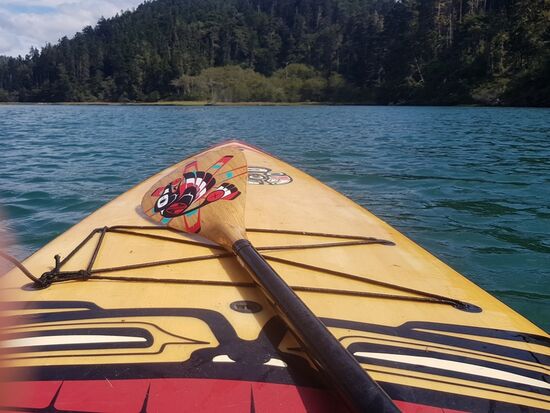 Lunch gibt es im sehr gut besuchten Good Life Cafe in Mendocino. Dann möchte ich noch eine Runde auf dem Big River gleich bei Mendocino paddeln. Beim Verleiher "Catch a Canoe" bekomme ich ein langes Board "GREAT BEAR". Das ist inklusive des Paddels mit "Native Art" verziert (die aber aus China kommt). Es ist recht windig, so gehe ich nach knapp zwei Stunden wieder an Land und bummle noch am Big River Beach entlang. Den Tagesabschluss bildet ein Stadtbummel im Künstlerviertel von Mendocino.