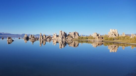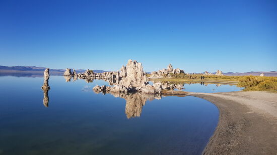 Bei der Rückkehr ist der Strom wieder da. Ich möchte mir noch das Tuffsteingebiet am Mono Lake ansehen. Das ist nur etwa 20 Minuten mit dem Auto entfernt. Vom Parkplatz aus gibt es einen Rundwanderweg am Ufer, der durch die eindrucksvollen, aber fragilen Tuffsteingebilde führt.