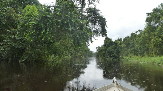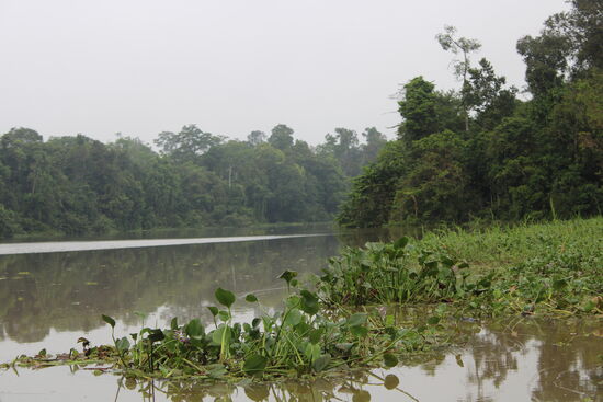 Die gespannten Seile von Flußseite zu Flußseite sind für die Orang Utans gedacht. Das ist die einzige Affenart, die nicht schwimmen kann.