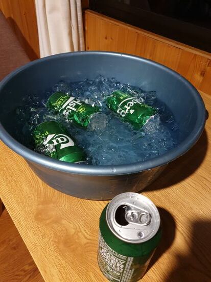 Egal, das Seafood war sehr lecker, und das Improvisiert gekühlte Bier auch.