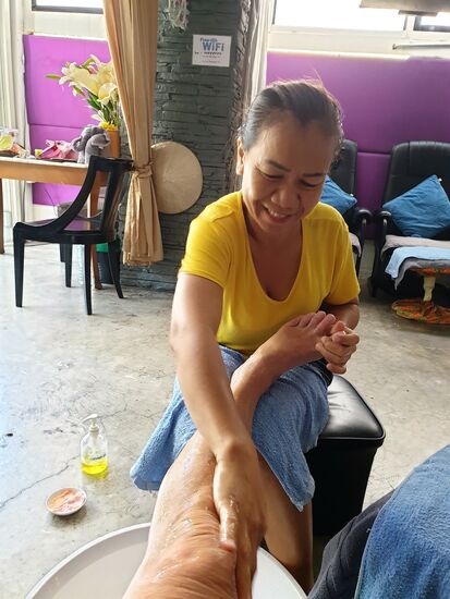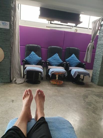 Ich gönne mir noch eine Fußmassage, die dann ruckzuck um eine Kopf- und Nackenmassage erweitert wird. Gegen Geld natürlich, aber mein Nacken hat sich gefreut.