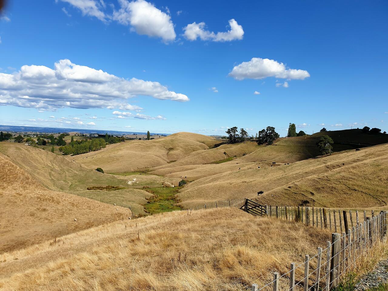 Fahren durch eine hügelige Landschaft, sandfarben abwechselnd mit Wiesen.