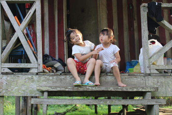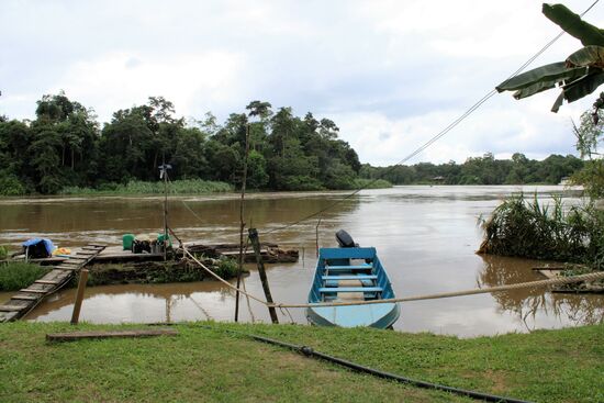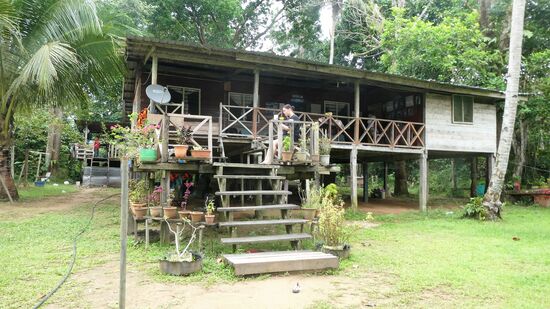 Nur mit dem Boot zu erreichen, auf der anderen Seite des Dorfes, drei Häuser, vorne der Fluß, rechts, links und hinten Dschungel.