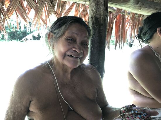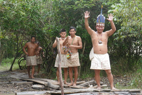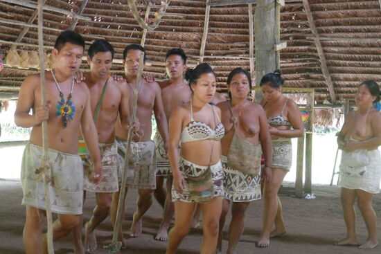 Es ist aber wie vieles im Leben nicht ganz so einfach. Die Boras wie auch die Yahuas wurden vor über fünfzig Jahren, als der Tourismus hier aufkam, von anderen Orten hierher gebracht. Als Touristenattraktion sollten sie ihr Leben draussen vor den Toren der Stadt führen, als Teil der Dschungeltouren in den verschiedenen Lodges hier draussen. Sie tragen ihre traditionellen Kleider, Lendenschürze aus einem Stoff, den sie aus geklopften Baum-Rinden herstellen. Frauen sind oft barbusig, junge tragen inzwischen Oberteile aus dem gleichen Material. Sie tanzen und singen, nehmen die Touristen an der Hand und lassen sie mittanzen.