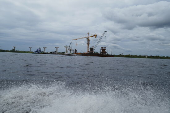 Wir fahren auf dem Rio Momon und da sehe ich die grosse Baustelle, die mir schon auf dem Frachter aufgefallen ist, aus der Nähe. Eine lange Brücke soll hier entstehen, eine neue Strasse, die Iquitos mit Indiana und später wohl mit der brasilianischen Grenze verbinden soll. Im Moment stehen erst die Brückenträger, aber es ist schon jetzt ersichtlich, dass das Bild sich hier in Zukunft extrem verändern wird. Ausser der knapp 100 km langen Strasse nach Nauta in den Süden gibt es hier im Umkreis von tausenden von Quadratkilometern keine Strassen und schon gar keine Brücken.