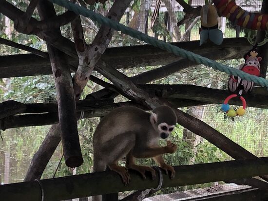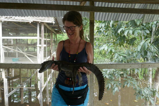 Ausserdem gibt es noch die Mata Mata, eine Wasserschildkröte, Landschildkröten, einen stolzen Adler und ein einsames Reh zu bestaunen. Ausserdem einen kleinen Aligator. Eveline ist die Mutigste unter uns.