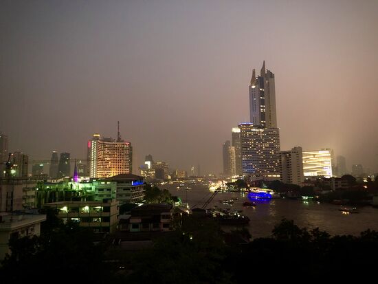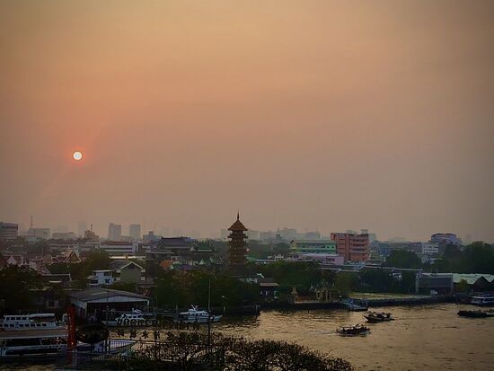 -Bootfahren am Chao Phraya. Am Wasser ist es immer schön! Neben den Transportqualitäten des Expressbootes (siehe oben) ist vor allem die Passage von Wat Pho über den Fluß zu Wat Arun zu empfehlen. Ein langsames Boot, das einen fantastischen Blick auf Bangkoks Skyline zulässt, Preis 4 Baht (15 Cent) pro Nase. kann man auch mehrfach machen und der Fahrtwind macht wieder angenehm frisch.