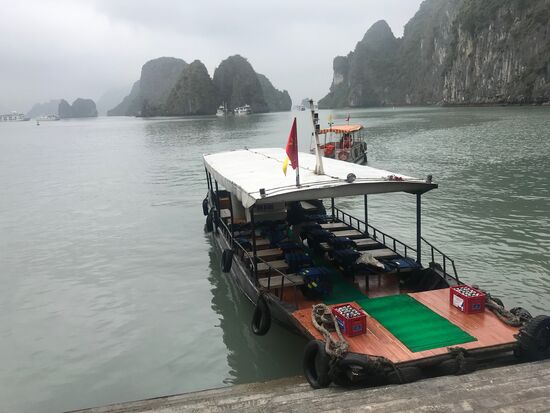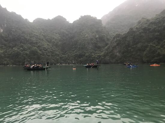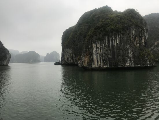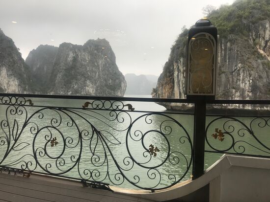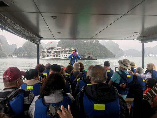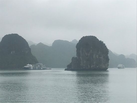 Wir fahren langsam in Richtung Bucht mit den vielen Inseln und grünen Steinfelsen. Ein schönes Bild, auch wenn die vielen Luxusliner, die mit uns ablegen, so gar nicht in das erwartete Bild von Dschunken mit roten Segeln und Fischerbooten passen. Der Kommerz hat die Bucht im Griff, und allen Gästen wird offenbar ein ähnliches Programm geboten. Wie auch immer. Auch hier genießen wir die Annehmlichkeiten und erfreuen uns an der vorüberziehen Natur. Die Kabinen sind wider Erwarten groß und geräumig, wie ein Hotelzimmer an Land mit eigenem Bad und Balkon. Das Zwischen- und obere Sonnendeck sind geräumig und sehr geschmackvoll eingerichtet, allein die Sonne und Wärme fehlt, um beides zu genießen. Die Bucht liegt im Nebel, das Grün ist nur beim unmittelbaren Vorbeifahren zu erkennen.
