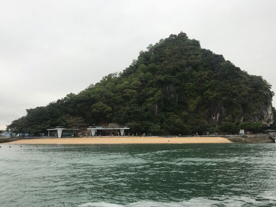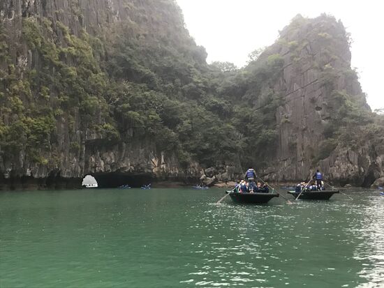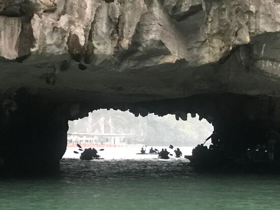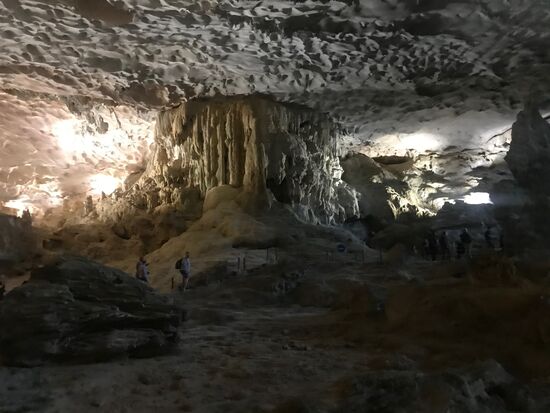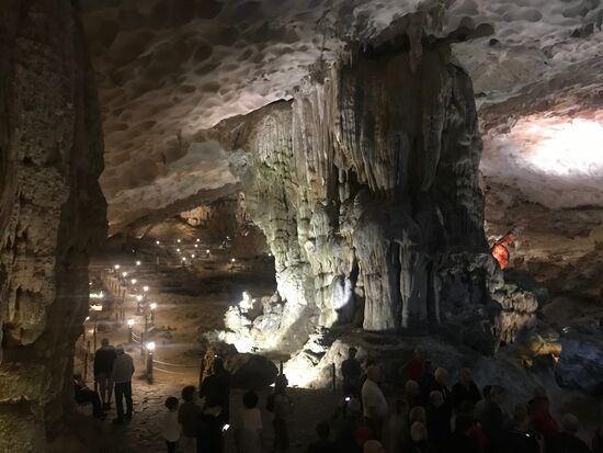 Wir werden am ersten Nachmittag mit einem vollen Programm beschäftigt. Lunch mit tollem Ausblick auf die vorbeiziehenden Steinfelsen, dann Fahrt mit dem Kleinboot zur Insel Sung Sot und Besuch der Surprising Cave, einer in mehrere unterschiedlich große Kammern unterteilten Tropfsteinhöhle, die Anfang des letzten Jahrhunderts von einem Franzosen entdeckt wurde und seit gut 20 Jahren der Öffentlichkeit zugänglich ist. Und wirklich ein gut ausgebauter und gesicherter Weg führt zunächst zum Eingang und dann durch die gesamte Höhle.