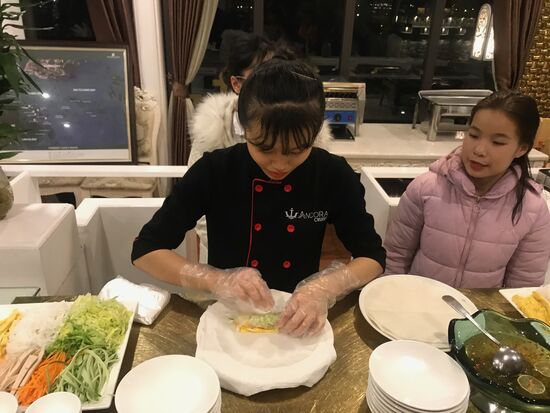 Auf der Rückfahrt zum Schiff wird das Wetter ungemütlich, es regnet, es windet und es wird kühl. Vor dem gesetzten Abendessen an Bord wird vom Bordpersonal demonstriert, wie frische vietnamesische Frühlingsrollen zubereitet werden, und es wird zum Mitmachen aufgefordert. Selbstverständlich können die Rollen dann auch verzehrt werden.