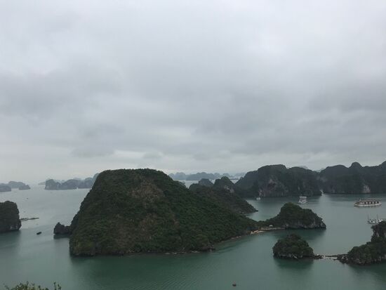 Pünktlich um halb acht geht es am nächsten Morgen los zur Titop oder Titov Insel, die nach dem zweiten Kosmonauten im Weltall benannt wurde.. Ho Chi Minh persönlich soll die Namensgebung entschieden haben, anlässlich des gemeinsamen Besuches der Insel im Jahr 1962. Ein großes Monument begrüßt die Besucher, die von ihren Schiffen in der Bucht vor der Insel fast zur selben Zeit eintreffen, um die 450 Stufen zur Aussichtsplattform heraufzusteigen. Von oben bietet sich ein tolles Panoramabild auf die Bucht, auch wenn die Sonne nicht vom blauen Himmel scheint. Und wohl alle Aufnahmen von der Halong Bucht scheinen von dieser Aussichtsplattform aufgenommen worden zu sein.