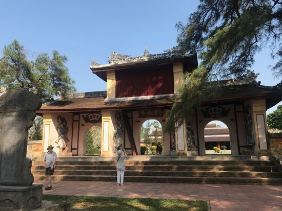 Die alte Kaisergrabanlage von Tu Duc eine gute halbe Stunde vom Flughafen entfernt, ist kaum besucht, aber sehr gut erhalten, auch mit deutscher Hilfe saniert, wie uns Herr Dung immer wieder berichtet. Verschiedene Pavillons inmitten von einem hohen Pinienwald und kleinen Teichen voller Seerosen verbreiten eine ruhige und entspannte Atmosphäre.