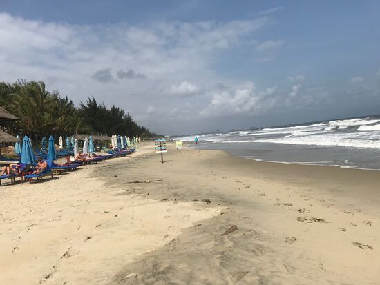 Unseren zweiten Tag in HoiAn beginnen wir mit einer Radtour durch das quirlige morgendliche HoiAn zum Meer. Unser Hotel betreibt eine Strandanlage, die unser Ziel ist. Wir kommen an kleinen schmucken Häuschen, luxuriösen Hotelanlagen sowie saftig grünen Reisfeldern vorbei.