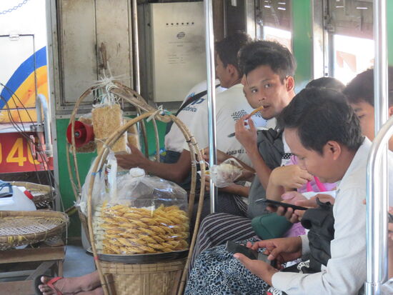 Eine Strecke fahren wir mit der Circular Train, der einzigen innerstädtischen Bahn. Ansonsten gibt es Busse und Taxen im öffentlichen Nahverkehr. Die Fenster sind offen, und auch sonst geht es auf den Bahnsteigen und im Zug recht rustikal zu.