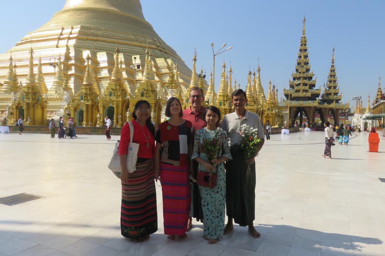 Unser zweiter Tag in Yangon beginnt mit dem Frühstück auf der Dachterrasse unseres Hotels mit Blick auf die goldene Spitze der Shwedagon Pagode, dem buddhistischen Heiligtum Myanmars. Vor dem Westeingang der Pagode werden wir dann wenig später von Soe, ihrer Tochter und ihrem Mann begrüßt. Sie haben für uns den Tag geplant: wir machen zunächst einen Rundgang durch die Tempelanlage der gut 90 Meter hohen Pagode, für deren Bau fast 60 Tonnen Gold verwendet wurde.