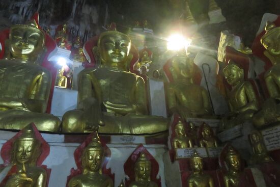 Warum die meist nicht wohlhabenden Menschen nicht allein die Mönche selbstlos unterstützen, sondern auch viel Geld für Opfer und Spenden in den Pagoden lassen, fragen wir uns auch beim Besuch der Pindaya Höhle, eine Stunde Fahrt von Heho entfernt, im Verwaltungsbezirk der Danu. Eigentlich eine wunderschöne Naturtropfsteinhöhle auf halber Höhe eines Berges mit Blick auf einen künstlichen See ist vollgestellt mit mehr 8500 Buddhafiguren unterschiedlicher Größe und Aussehens, sodass der Naturstein nur zu erahnen ist. Kim erzählt uns, dass die Entstehung der Höhle auf eine wunderschöne Geschichte von einem Prinzen und sieben Schwestern zurückgeht. Danach hat der Prinz die Schwestern vor einer Riesenspinne gerettet, die die Mädchen angreifen wollte, während sie sich in der Höhle nach dem Baden im See ausruhen wollten. Die Spinne ist am Höhleneingang noch zu sehen. Erst im Mitte des letzten Jahrhunderts wurde die Höhle wirklich durch einen Engländer entdeckt und in der Höhle drei alte Buddhafiguren aufgefunden. Seither werden mit dem alten Buddhas Wunderkräfte für das irdische Dasein verbunden, sodass stets neue Buddhas von Pilgern aus aller Welt in der Höhle aufgestellt werden. Heute erfolgt das sehr einfach elektronisch, so erklärt uns Kim, auf einer eigens für die Spende eingerichteten Webseite. Auch hier wird das Geld auch für die Erhaltung der Höhle und die Bezahlung des Personals verwendet. Die „Buddhabesitzer“ kommen immer wieder zu ihren Statuen und erhoffen sich viel Gutes im Leben durch ihre Spenden. Kim gibt auf unsere Nachfrage zu, dass das Geld oftmals für karitative Zwecke besser aufgehoben wäre.