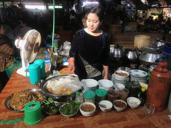 Typische Myanmarküche: Reis mit vielen kleinen Gerichten, kalt und warm serviert in vielen unterschiedlichen Geschmacksrichtungen.