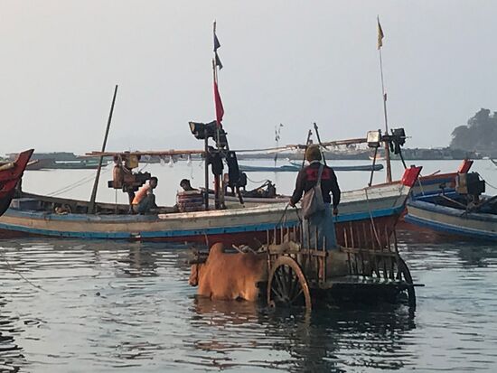 Mit Ochsenkarren holen die Fischer den alltäglichen Fischfang von den vor der Küste angelegten Fischerbooten.
