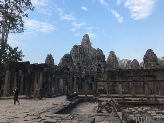 Wir hatten uns vor Antritt mit John auf die kleine Tempeltour geeinigt, die mit dem Sonnenaufgang in Angkor Wat beginnt und am Tempel Kravan, einem der ältesten Tempel aus dem 10. Jahrhundert in der Anlage, endet. Wir sind rund 8 Stunden unterwegs und erhalten einen tiefen Eindruck von der Monumentalität und dem Ausmaß der ehemaligen Bauten, dem Reichtum an Material, aber auch an menschlichen Fähig- und Fertigkeiten der damaligen Zeit. Angkor Thom war im 11. und 12. Jahrhundert die weltweit mächtigste und größte Stadt. Die Geschäftigkeit des ehemaligen Treibens einer Stadt ist längst Geschichte, geblieben ist die besondere Atmosphäre, die von den verfallenen Bauten, übriggebliebenen Steinhaufen und Anlagen ausgeht. Da wir bereits vor der offiziellen Öffnungszeit um 7.30 Uhr in der Anlage unterwegs waren, spazierten wir durch menschenleere Ruinen umsäumt von hohen Bäumen und genossen die Stille, die von den Anlagen ausgeht. Auch nach der Öffnung der Tempel hielt sich der Andrang sehr in Grenzen. Die chinesischen Touristen, die wohl fast 80 Prozent der täglichen Besucher ausmachen sollen, fehlen aufgrund des Coronavirus. Auch wenn die Einheimischen nicht immer eins sind mit den chinesischen Besuchern, aber ihr Geld fehlt. Und das ist überall festzustellen. Die Tuktukfahrer haben nicht mehr so viel Kundschaft, die Markstände vor den Tempel sind wenig besucht, die Restaurants verfügen über viel freien Platz. Für uns ist es Glück im großen Unglück der chinesischen Bevölkerung, die im eigenen Land unfreiwillig eingesperrt ist.