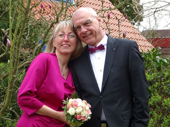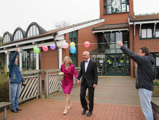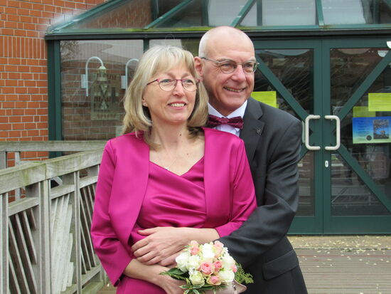 Draußen warten mit einer Luftballon - Girlande Jürgen und Angela auf uns. Auch meine Schwester ist gekommen. Gratuliert wird uns auf Abstand - Umarmungen fallen aus. Liebe heißt in diesen Zeiten Abstand halten. Deshalb haben auch viele Verwandte und Freunde darauf verzichtet zu kommen und wir danken ihnen dafür.