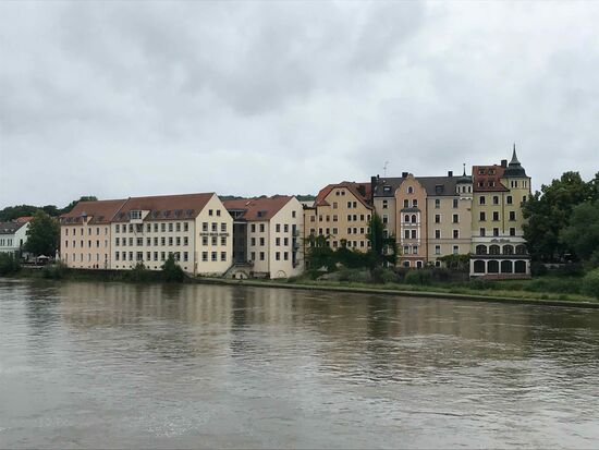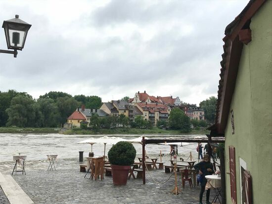 Ein tolles Frühstück und Sonnenschein erwarten mich und zuerst geht es mit dem Boot nach Kelheim zurück, dann an der Donau entlang nach Regensburg. Das Wetter ist bis gegen Mittag sehr schön, dann sieht man Richtung Regensburg dicke schwarze Gewitterwolken. Ich treffe die „falsche“ Entscheidung und kehre erst mal in einen schönen Biergarten ein. Nach einer guten halben Stunde Pause sieht es fast so aus, als ob sich der Regen und Gewitter verzogen haben, die lauern aber hinter der nächsten Kurve.