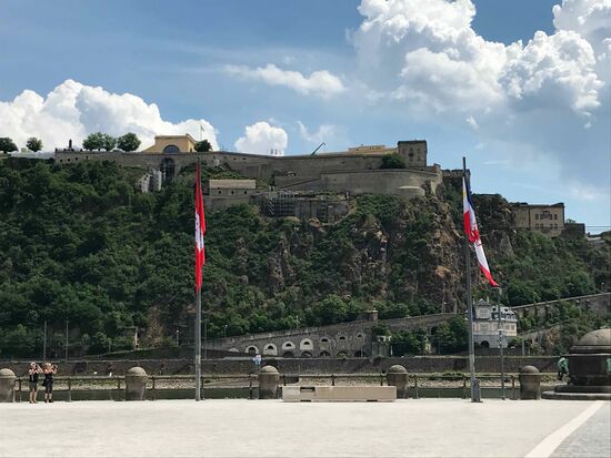 Da ist das Tagesziel, die Festung Ehrenbreitstein. "Nur" 120 m über dem Rhein, aber die Straße da hinauf hat eine ganz schöne Steigung. Dort befindet sich die Jugendherberge.