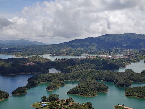 volle kanne ging es weiter; der 70 kilometer entfernte felsen von guatapé stand auf dem programm. in aller hergottsfrühe mussten wir aufstehen, was aber kein problem war, weil wir eh schon sehr früh wach waren. ein liebestolles pärchen tat um 5 uhr morgens dinge, welche eben ein liebestolles pärchen so tut. also waren wir sogar ein bisschen zu früh am abgemachten treffpunkt. der guide maurice sprach fliessend spanisch und englisch, also konnte er unsere gruppe (dom. rep., usa, kolumbianer und wir) in beiden sprachen perfekt informieren. nach einer einstündigen fahrt kehrten wir für ein leckeres frühstück ein. wir fuhren daraufhin an den stausee von guatapé und mit einer bootstour erkundeten wir die wunderschöne gegend. meine fresse, was hatte es da für villen. kein wunder, dass pablo escobar sein domizil dort aufbaute, inkl. seperater villen für seine schwester, seinen bruder und seine mutter. seine ranch wurde bei einer offensive der armee gegen ende seiner ära zusammen gebombt und ist total ausgebrannt. und auch der kolumbianische fussballstar james rodriguez hat dort ein nettes häuschen gekauft, für läppische 4.5 mio dollar. durch den bau des staudammes mussten auch einige leute zwangsumgesiedelt werden bzw. ein ganzes dorf wurde geflutet. ein kreuz auf dem see zeigt noch heute, wo die kirche viele meter unter wasser gestanden hat.