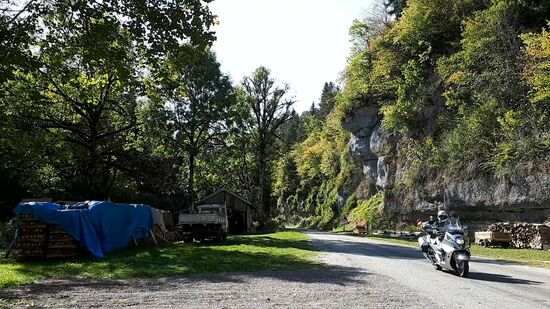 Kurz vor Pontarlier, der Hauptstadt des Absinths, stoßen wir wieder auf den Doubs. In geschmeidigen Kurven zieht sich das Asphaltband durch ein einsames Hochtal, während sich der Fluss durch sanfte Auen schlängelt. Die ehemalige Abtei von Montbenoît huscht vorbei. Plötzlich ändert sich das Bild. Schroffe Kalkfelsen tauchen auf. Der Doubs, eben noch ein Wald- und Wiesenfluss, hat sich hier durch die Jahrtausende tief in den Fels gefressen. Wir sind in der „Défilé d'Entreroche“. Ein Schild "Achtung! Kurven auf 7 km” taucht kurz am Straßenrand auf. Straße und Fluss schneiden sich in eleganten Windungen mitten durch das Juragestein. Felsüberhänge schweben über der Fahrbahn und sorgen für beeindruckenden Fahrspaß. Kaum haben wir uns an dieses wilde Kurvenabenteuer gewöhnt, beruhigt sich der Doubs wieder und die Straße der Uhren beginnt.