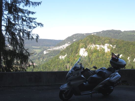 Hinter Villers-le-Lac verlieren wir den Fluss zwischen unzugänglichen Schluchten und stehen plötzlich vor einem unscheinbaren Zollhäuschen im Niemandsland. Wir sind nun auf schweizer Staatsgebiet und prompt verfahre ich mich. Gerade noch auf einer Straße rollen wir nun auf einem Feldweg dahin, der sich allerdings recht malerisch durch weite Wiesen am Hang entlang zieht. Dichter Wald nimmt uns auf, um uns bald darauf wieder auszuspucken. Wir sind allein in der Einsamkeit (wenn man Kühe nicht mitzählt). Diese endet auf der Cote du Doubs, die uns zurück nach Frankreich und somit in die malerische „Corniche de Goumois“ bringt. Felsige Steilhänge, manche mit Bäumen bewachsen. Gelegentlich graugrüne Weiden. An der 3 km langen Panoramastrecke gibt es herrliche Aussichtspunkte, mehr als 100 m über der Schlucht gelegen. Weit reicht der Ausblick in das tiefe Tal.