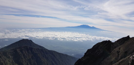 Bei Tageslicht,immer wieder den ash cone und den Kilimandscharo im zunehmend gleißenden Morgenlicht zur Rechten, genießen wir zunächst das Absteigen in vollen Zügen.
